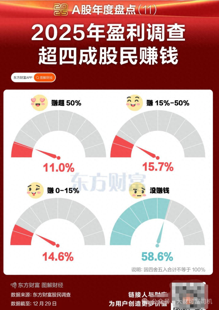 东方财富网搞了一个2025年股民盈利调查。这份问卷调查的参与人数超3万人。调查显示,有58.6%的股民声称年内没赚钱。余下的41.4%赚钱的股民中,有11%的股民表示年内赚超50%;15.7%的股民赚15%-50%;14.6%的股民赚0-15%。