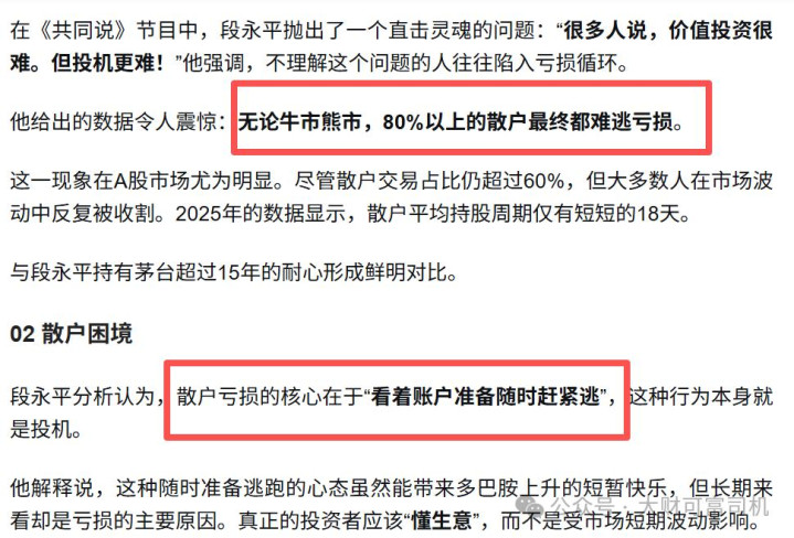 投资大师段永平最近在访谈中表示:“投机更难!不管牛熊市,80%散户都在亏,因为他们总想着赚快钱,看着账户就准备随时逃。”